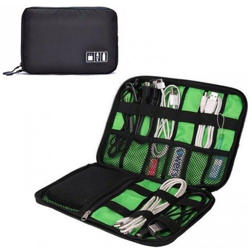 Als u op reis gaat, dan heeft u waarschijnlijk veel verschillende kabels mee. Een oplader met snoer voor smartphone en tablet, een kabel voor de camera, oordopjes om muziek te luisteren, en ga zo maar door. Houd de kabels en opladers netjes bij elkaar met deze opbergtas. De tas heeft 9 vakken voor kabels en een vakje van geweven gaas met rits.
